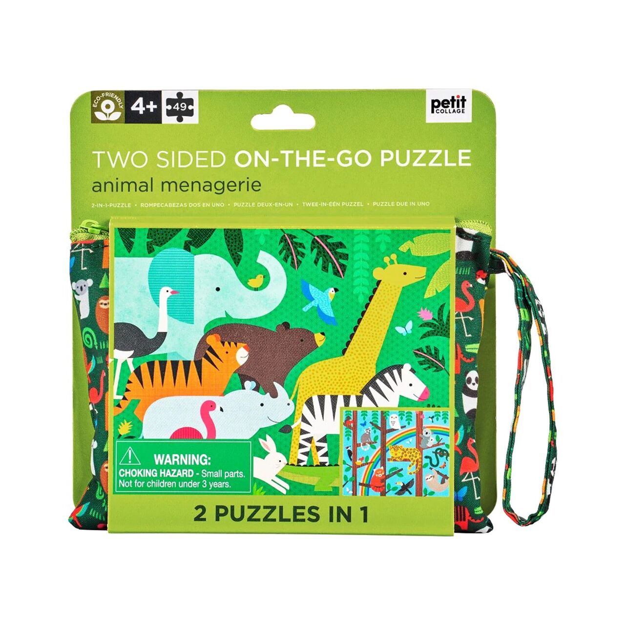 Hayvan temalı 49 parçalı çift taraflı bu yapboz taşınabilir saklama çantası sayesinde her türlü seyahatte yanınıza almanız için idealdir. - İki benzersiz tasarıma sahip iki taraflı 49 parçalı yapboz. - %100 geri dönüştürülmüş polyester kumaştan yapılmış kullanışlı fermuarlı saklama çantası. -FSC kağıdına basılmıştır. - Plastik içermeyen ambalaj. Birleştirilmiş yapbozun boyutları: 36 x 29 cm 5 yaş ve üzeri için uygundur.