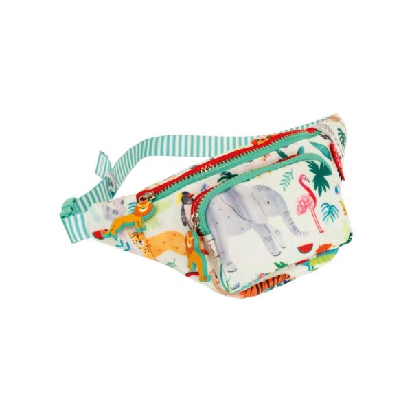 Jungle tasarımında aslan şeklinde fermuarlar, iki bölme ve çizgili malzemeden ayarlanabilir bir askı bulunur.