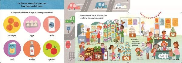 The start of a new series, this colourful illustrated flap book is aimed at toddlers to help improve their observational and language skills by seeing inside buildings and discovering lots of things in the town. The large, shaped flaps are easy for toddlers to use and there is lots to search for and find in the bright and colourful illustrations. There is lots of lift-and-learn fun on every spread, with a big gatefold flap to open to see inside each building. Each double-page spread introduces a different shop or building, and has colourful illustrations of characters and everyday objects inside.