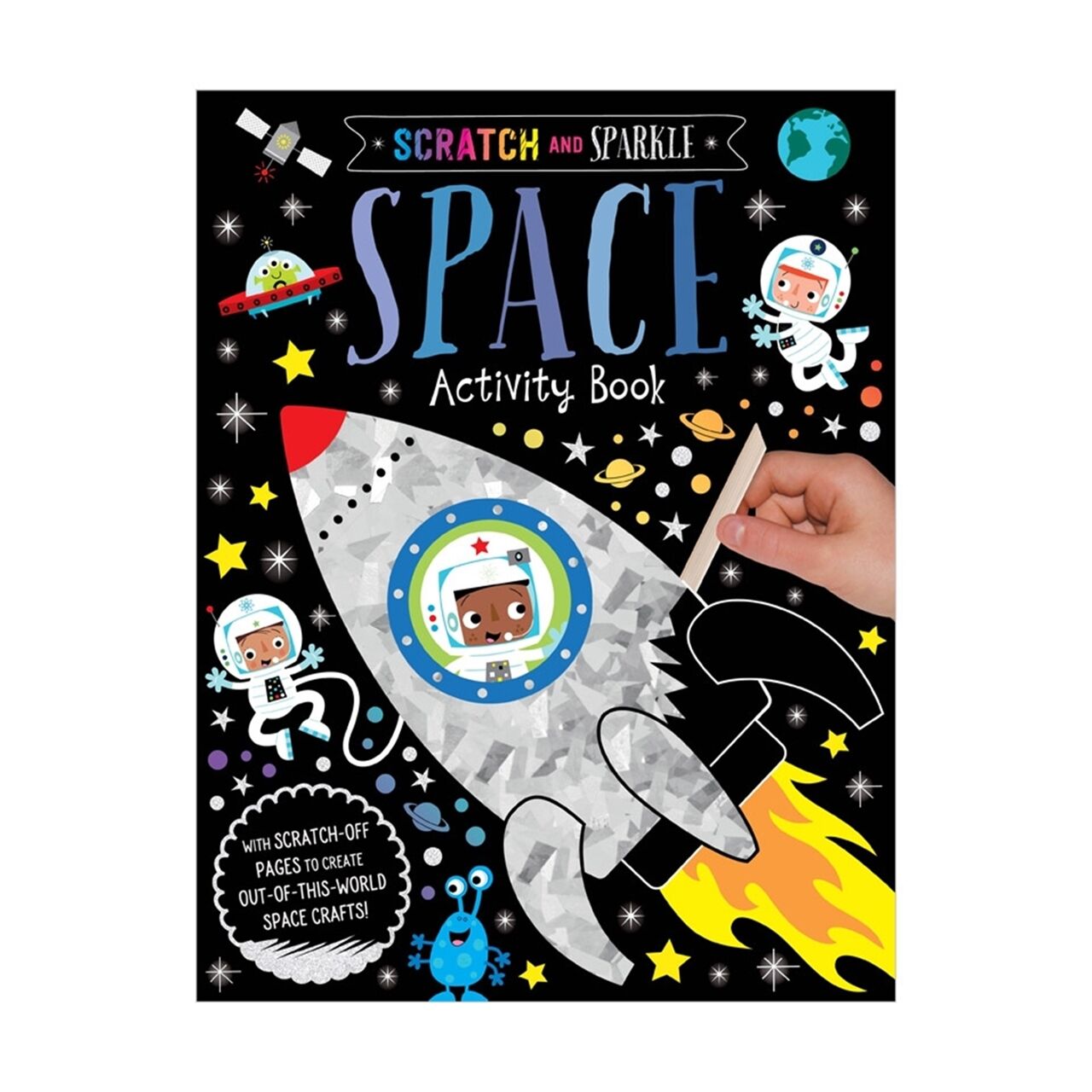 Çocukların bu dünyanın dışında sanat ve el işleri yaratmak için kullanabilecekleri bir kazıyıcı içeren, eğlenceli bir karalama ve ışıltı alanı aktivite kitabı.